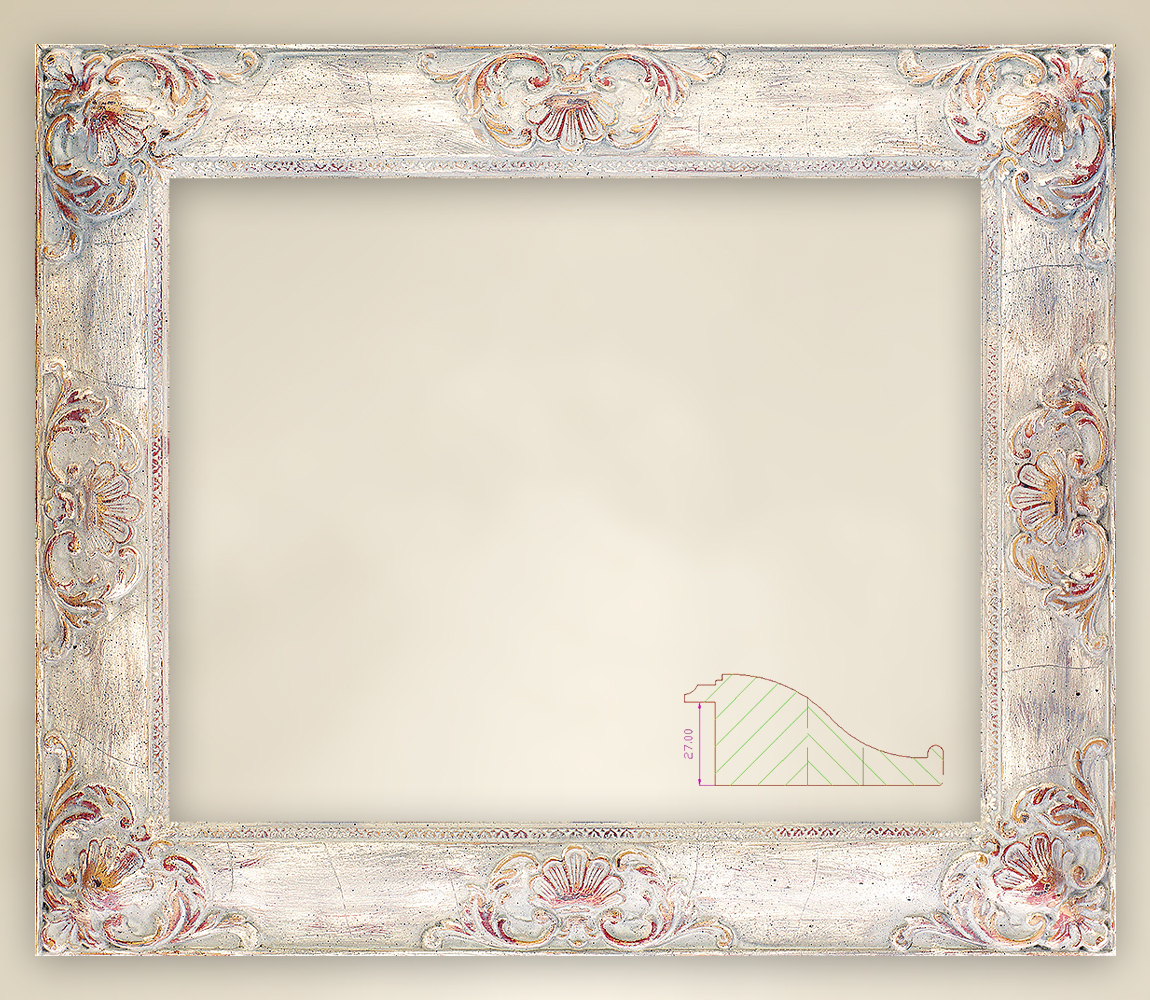 | Mit viel Sorgfalt in liebevoller Handarbeit gefertigt, ist auch der Gemälderahmen Angelique. Er gehört zu der Rahmenserie Edge, die die Königsklasse unter den Modellen bedeutet. Auf Kundenwunsch wird der Echtholzrahmen nach georderten Maßen zugeschnitten und erst hinterher mit den Ornamenten von Hand bestückt. Dabei wird darauf geachtet, dass die Anordnung der Zierelemente passgenau auf den Rahmen gebracht werden, in jedem Winkel befindet sich eines von ihnen sowie jeweils eines genau in der Mitte einer jeden Rahmenleiste. Demnach gehören acht Dekore auf jeden der Königsklassenrahmen, dabei spielt es keine Rolle, welche Rahmengröße der Kunde wünscht - denn genau auf diese wird die Gestaltung angepasst. Angelique ist ein Zierrahmen in Weiß mit Ornamenten und wurde von seinen Machern in einer Art barockem Design gestaltet. Bereits bei der Anfertigung des rohen Echtholzrahmens wurde eine für den Barock klassische Anordnung der verschiedenen Leisten gewählt. Beinah wie selbst gerahmt, wirkt Angelique durch die äußerste schmale, schlicht gehaltene Leiste. Wie eine bauchige Dame ergießt sich die Hauptleiste daraufhin in einem großen Bogen nach unten und in den Raum hinein. Diese Wölbung wirkt besonders weich, da sie sich wie eine gemütliche Rundung nach vorn bewegt. Ein zierliches Doppelleistengespann rahmt die Bauchleiste noch einmal im inneren Bereich, so dass ein harmonisches Ganzes der Leistenabfolge entsteht. Die Innenleiste ist mit filigranen floralen Schnitzereien übersät, die engmaschig aneinander gereiht sind. Die Verzierungen auf der Hauptleiste zeigen ebenfalls barocke Blumenmuster. Großformatige Blütenblätter werden von diversen Ranken umgeben und bilden zusammen eine tolle Einheit. Während sich das Leistendekor eher flach der Waagerechten des Rahmens anpasst, breiten sich die Winkeldekorationen nach allen Seiten hin aus und bestätigen geradezu das ausbreitende Wesen der wachstumsfreudigen Ranken. Der gewölbte Bogen des Hauptrahmens, auf dem die Ornamente platziert sind, verstärken ihre voluminöse Art und geben Angelique diesen barocken Charakter. Dennoch sorgen großzügige Zwischenräume innerhalb der Zierelemente dafür, dass sie ihre filigrane Note dennoch beibehalten. Als Grundfarbe wählten die Designer ein schlichtes Weiß, das allerdings seine Einfachheit durch zahlreiche gestalterische Effekte eigentlich verloren hat und als ein Weiß der Superlative erscheint. Die weiße Grundleiste teilt sich demnach das Echtholz gemeinsam mit Nuancen in Grau, in Beige sowie mit vereinzelt auftauchenden dunklen Flecken, die in gesprenkelter Form hierauf drapiert wurden. Neben besagten Punkten geben auch weitere Strichakzente dem Rahmen eine haptisch schöne Struktur, die im Ganzen matt gehalten ist. Glanzpunkte wiederum verleihen farbige Elemente, die auf der Innenseite, aber auch auf den großen Ornamenten aufgetragen sind. Hier kommt ein Rot in zahlreichen Nuancen zum Tragen - von Feuerrot, über ein herrlich sonniges Orange bis zu einem dezenten Ton in Apricot. Diese Töne wechseln sich immer wieder ab, sind auf den Ranken zu sehen, toben sich auf den Blütenblättern fröhlich aus, um auch noch einmal die florale Innenleiste zu streifen. |