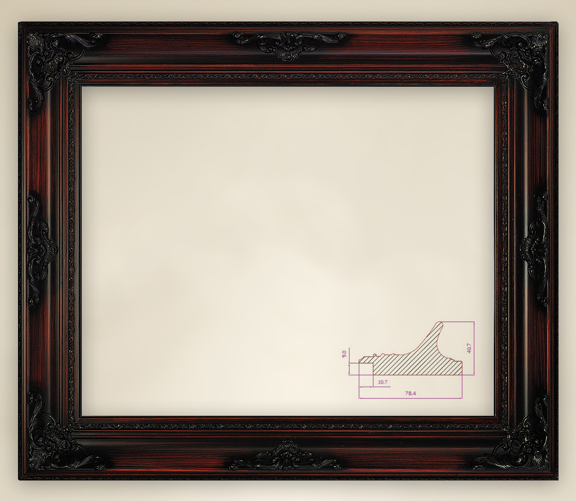 | Außerordentlich in Form und Farbe wurde der Gemälderahmen Antoinette gestaltet. Aus der Edge-Serie stammend, ist auch dieses Stück ein Unikat, da es in echter Handarbeit gefertigt ist. Antoinette gehört somit zur Königsklasse unter den Rahmen. Hier werden Wünsche wahr - denn, wer seine Größe bei der Bestellung abgibt, kann sich sicher sein, dass sein persönlicher Antoinette-Rahmen sorgfältig handgefertigt wird. Nach dem Zuschneiden des Echtholzes kommen die Ornamente anschließend auf die Leisten, so dass die Ornamentenreihenfolge eingehalten wird. In jedem Winkel des Rahmens sowie mittig jeder Leiste sind diese angeordnet. Aufgetragen werden bei diesem Modell barocke Floralmuster, die mit Ranken und Blüten Aufmerksamkeit auf sich ziehen. Die Winkelelemente füllen jeweils die gesamte Rahmenecke aus, wobei sich die Ausläufer sowohl auf der vertikalen als auch auf der horizontalen Leiste ausbreiten. Die Rankenenden finden ihren Schluss gekonnt in Form eines geschnörkelten Bogens. In gleicher Weise, nur etwas schmaler, ist das Dekor auf der Rahmenmitte angebracht. Die akkurate Anordnung mit den gleichmäßigen Abständen von Winkel- und Mittendekor gibt dem Rahmen ein solides Aussehen. Weitere Gestaltungsaspekte machen Antoinette vollkommen. Die Leistenfolge ist bei diesem Stück etwas ganz Besonderes: Nach einer schlichten Leiste am äußersten Ende folgt nämlich eine weit hinausragende schmale Holzwelle, die sich 40 mm steil empor hebt und nach einer kleinen Rundung nach unten hin diagonal zurück abfällt. Hier schließt sich dann eine Abfolge mehrerer dezenter Borten an. Die Gesamtbreite beläuft sich dabei auf 78 mm. Hierauf ist genügend Platz für die Ornamente. Während die großen barocken Elemente dabei knapp über die Holzwelle schwappen, haben die Gestalter mit weiteren Zierleisten an den Außenseiten gearbeitet. Filigran kommen diese schönen Borten einmal am Randäußeren zur Geltung sowie noch einmal auf einer der schlichten Leisten zur Bildmitte hin. Bei der Wahl der Farbe hat man auf ein edles Mahagoni gesetzt, das sich den Platz auf Antoinette gemeinsam mit einem kräftigen Schwarz und hellen orangefarbenen Akzenten teilt. Das Mahagoni dominiert dabei die gesamte Echtholzleiste. Gestalterische Effekte mit Linien in Schwarz und Orange geben hier den Ton der Holzmaserung an. Der Natur entsprechend, wurden die Farben so eingebracht, dass Antoinette dem Edelholz nahezu Konkurrenz macht. Würdevoll fügt sich dieser colorierten Mischung das Tiefschwarz hinzu, in das die Ornamente getaucht sind, sowohl die Zierborten innen und außen als auch die Barockelemente. In der Gesamtansicht wiederum wirken die Farben wie ein dunkler, massiver Holzrahmen, für den es ein Leichtes ist, das passende Motiv zu finden. Kunstdrucke, die ebenfalls schwere Farbtöne aufweisen, verbunden mit historischen Themen, kommen in Antoinette besonders gut zur Geltung. Aufgrund der großen Sorgfalt, mit der dieser klassische handgefertigte Rahmen entsteht, sind die Lieferungszeiten etwas länger. Doch dies tut dem Kunstliebhaber und seinem gewählten Bild keinen Abbruch - wer etwas Außergewöhnliches ordert, wartet gern auf das begehrte Objekt. |