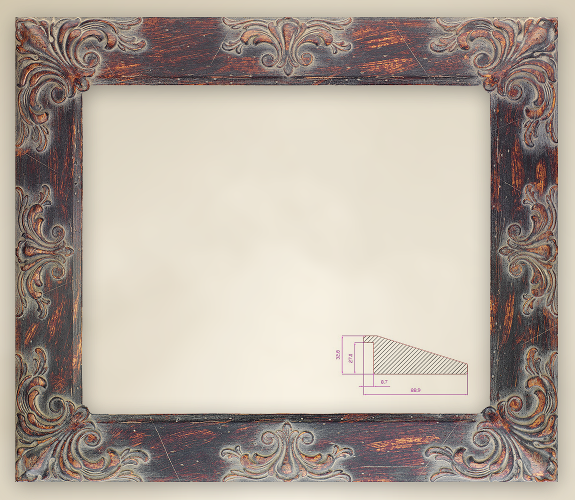 | Seraphina haben die Designer als braunen Zierrahmen erstellt, der dennoch durch verschiedene Gestaltungselemente ein eher helleres Modell ist. Das massive Braun von Seraphina wurde durch weitere Farbeffekte zu einer freundlichen Naturnuance kreiert, die auch Liebhaber von hellen Bilderrahmen beeindrucken wird. In der Gesamtansicht zeigt sich Seraphina als nahezu hell rötlicher Echtholzrahmen mit verschiedenen Ornamenten. Seraphina gehört zu der sogenannten Edge-Reihe, die ausschließlich von Hand gefertigte Zierrahmen bereithält. In diesem besonderen Sortiment ist jeder gestaltete Rahmen ein echtes Unikat. Die in Sorgfalt verarbeiteten Holzrahmen werden zunächst direkt nach den Wünschen des Kunden zugeschnitten. Der Kunstfreund kann sich bei den Rahmenmaßen an seine Räumlichkeiten halten und nach gemessener Größe genau das richtige Modell für sich bestellen. Nach dem Zuschneiden des Holzes werden anschließend dann die Ornamente per Hand präzise aufgebracht, so dass die Abfolge der Zierelemente genau eingehalten wird. Diese Königsklasse der Rahmen sieht dabei die Reihenfolge so vor, dass jeder Winkel des Rahmens sowie jede Leiste genau mittig mit jeweils einem Dekorobjekt versehen wird. Hier muss genau auf den Abstand geachtet werden, damit der Rahmen eben jenes spezielle Aussehen der Edge-Reihe erhält. Die Ornamente verleihen dem sonst eher soliden Rahmen, der eine schlichte, gerade Neigung von einem Winkel in etwa 30 Grad von außen nach innen besitzt, seine haptische Schönheit. Die Zierelemente bilden ein plastisches Dekor, das an Kunstobjekte des Barocks erinnert. Nach dem Vorbild einer Lilie bilden verschiedene Ranken die Objekte, die nach außen hin in schnörkeligen Voluten enden. Horizontal zur Holzleiste ranken sich die Ornamente mittig der Rahmen, fast in die Breite gezogen stehen sie dort ihren Mann. Die Winkelornamente hingegen kommen noch etwas majestätischer zum Ausdruck. Immerhin haben diese mehr Platz, um sich auf dem Rahmen auszubreiten. Diagonal zieht sich das Element von der äußersten Ecke zum inneren Winkel, um sich nach rechts und nach links jeweils den Weg in Richtung Rahmenmitte zu bahnen. Je kleiner die Maße des gewünschten Gemälderahmens ausfallen, umso dichter kommen sich die Ornamente aus Ecke und Mitte entgegen. Trotz des prallen plastischen Effekts sorgen die passenden Farbeffekte dafür, dass selbst diese Varianten nicht zu wuchtig wirken. Ein absorbierendes Grau wurde hinter die Ornamente platziert, so dass diese wie ein filigranes Individuum erscheinen. Wie von einem hellen Nebelschein umgeben, zeigen sich die barocken Blumenelemente reizvoll auf dem Holz. Dieses wiederum leuchtet durch die hellen Töne, die dem insgesamt braunen Rahmen hinzugefügt wurden. Sowohl die Ornamente selbst haben diesen warmen Orangeton erhalten als auch weitere dicke Pinselstriche, die als gekonnte Akzente die Leisten selbst originell schmücken. Künstlerisch wurde hier ein Borstenpinsel angelegt, um einen Effekt zu erhalten, der an einen antiken Rahmen erinnert. Diese Eigenschaft wird zudem von gewollten Gestaltungselementen wie Punkten, Kratzern und Abrieb verstärkt, so dass Seraphina als Rahmen mit altehrwürdigem Charakter gilt. |