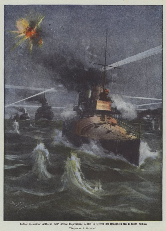Kühner nächtlicher Überfall unserer Torpedoboote in der Dardanellenstraße unter feindlichem Feuer(Audace incursione notturna delle nostre torpediniere dentro lo stretto dei Dardanelli fra il fuoco nemico )Achille Beltrame |