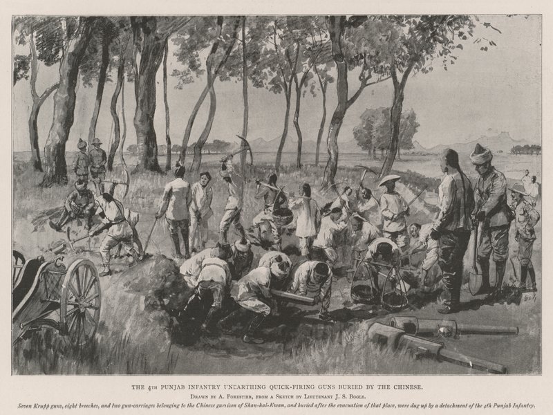 Die 4. Punjab-Infanterie entdeckt Schnellfeuerkanonen, die von den Chinesen vergraben wurden(The 4th Punjab Infantry unearthing Quick-Firing Guns buried by the Chinese )Amedee Forestier |