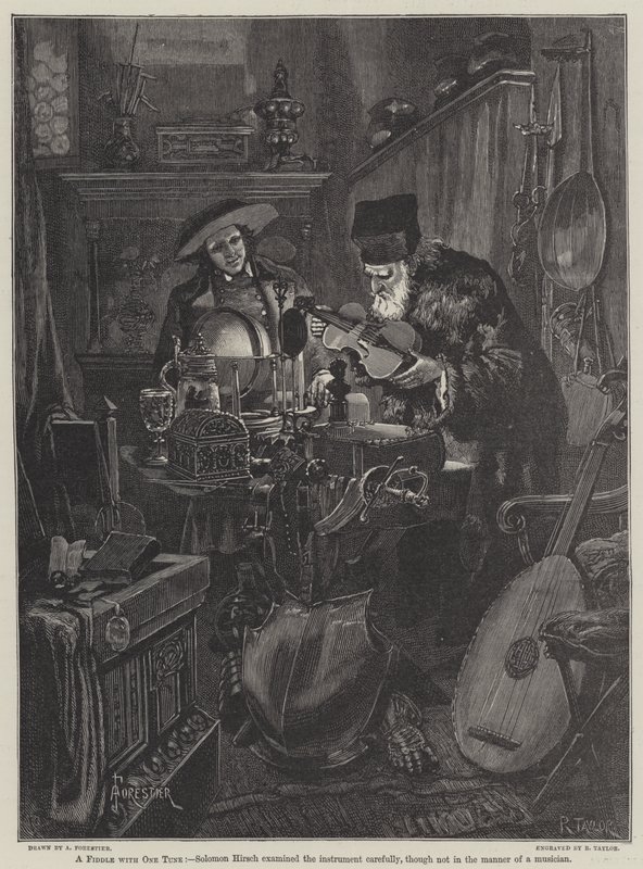 eine geige · one tune · re francillon · solomon hirsch · untersucht · instrument · vorsichtig · weise · musiker · violinen · musikinstrumente · unordnung · Private Collection / Bridgeman Images · / Look and Learn |