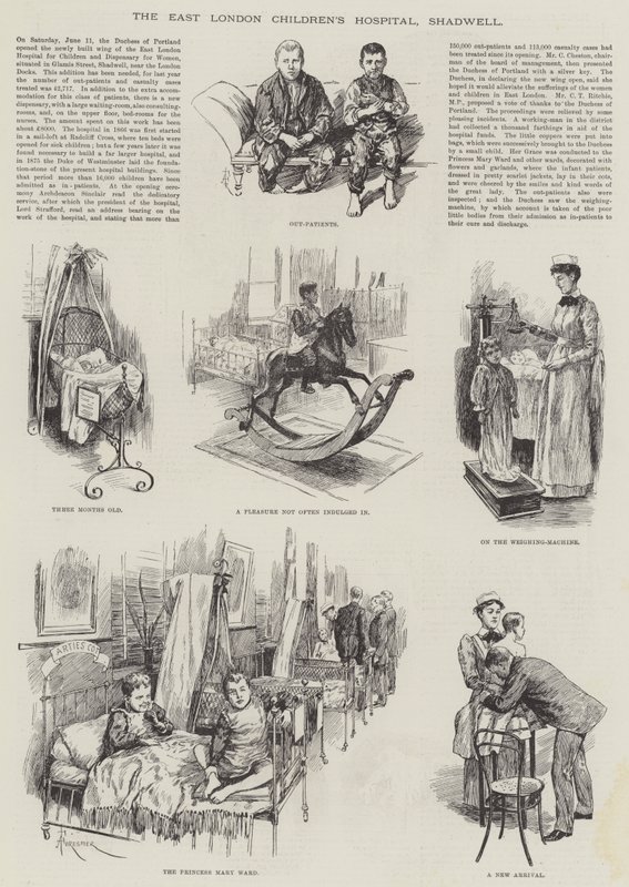 east london kinderkrankenhaus · shadwell · aus patienten · vergnügen · sich hingeben · waage · prinzessin mary ward · ankunft · krankenhäuser · london · kinder · krankenschwestern · Private Collection / Bridgeman Images · / Look and Learn |