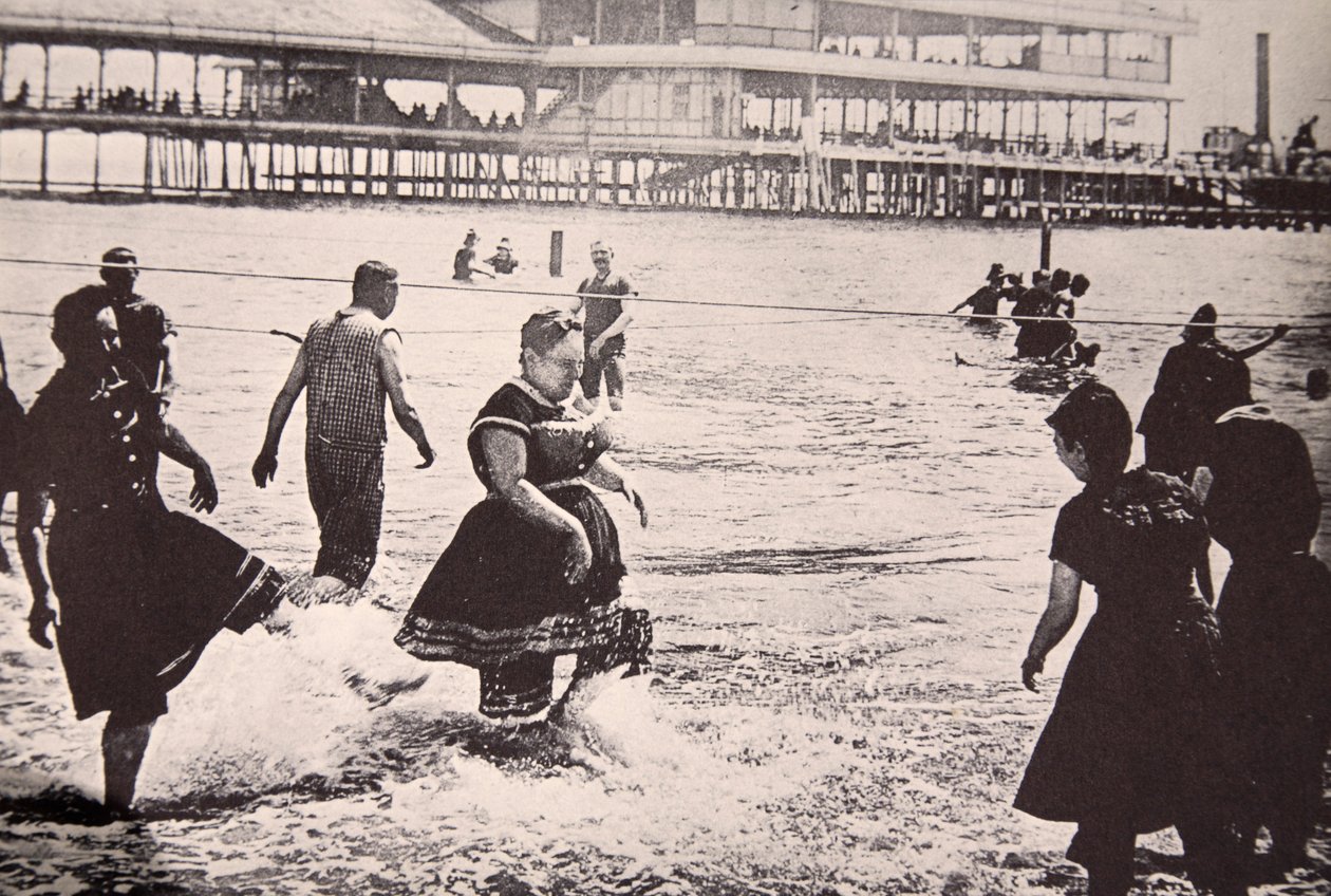 us-geschichte · vereinigte staaten von amerika · badegäste · badende · leichtfertigkeit · leichtfertigkeit · küste · meer · strand · pier · schwimmen · kostüm · frau · mann · urlaub · urlaub · freizeit · bescheidenheit · wellen · badeanzüge · anzug · edwardian kostüm · spaß · amerika · amerikaner · Nordamerika · Private Collection / Bridgeman Images |