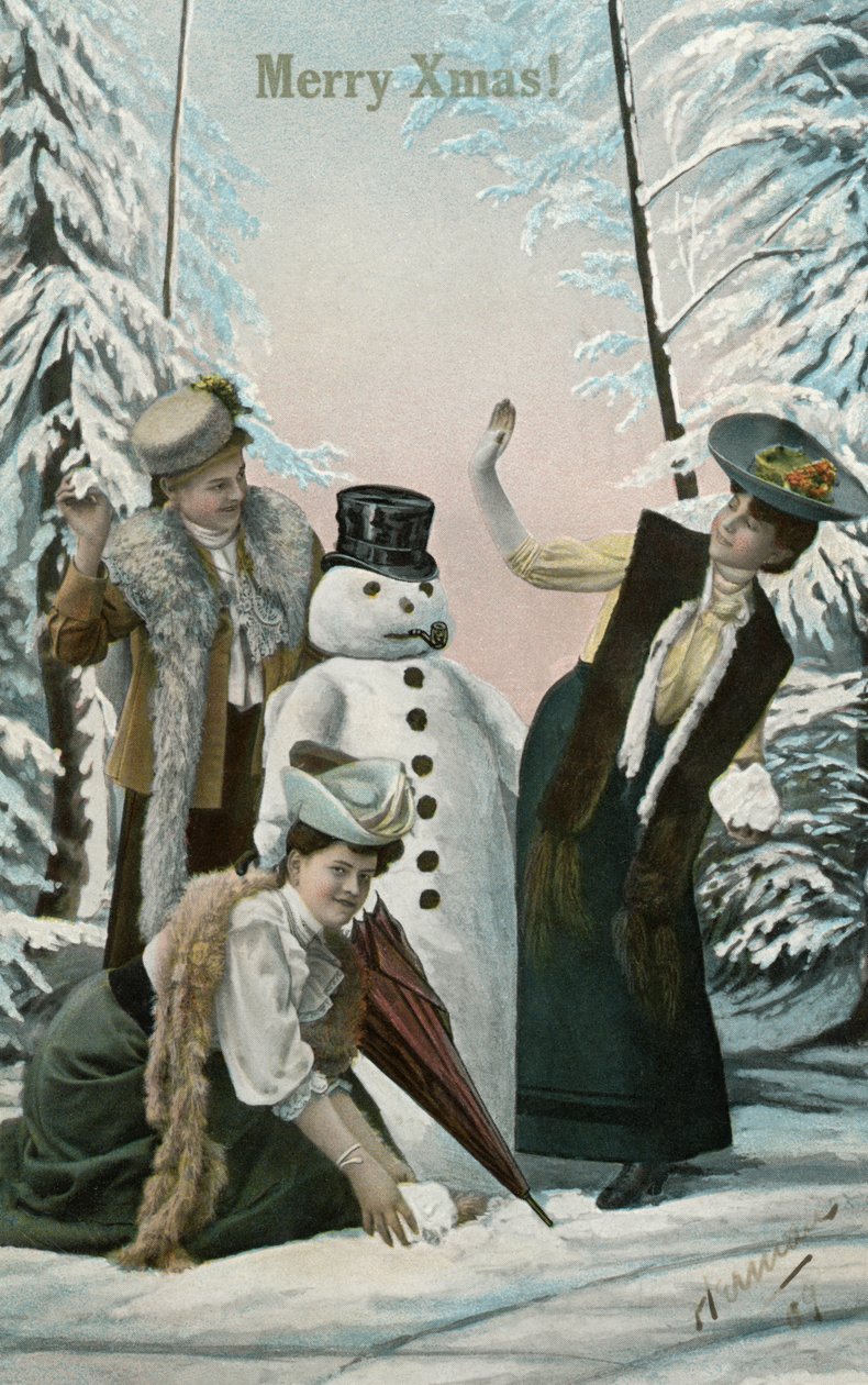 Viktorianische Frauen spielen mit einem Schneemann(Victorian Women Playing with Snowman)American School |