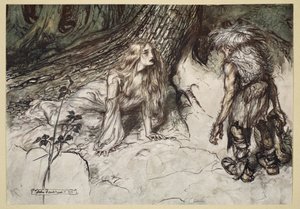 Schlafe du, und ich werde dich in meinen Armen wiegen, Illustration aus 'Ein Sommernachtstraum' von William Shakespeare, 1908(Sleep thou, and I will wind thee in my arms, illustration from 'Midsummer Nights Dream' by William Shakespeare, 1908 )Arthur Rackham |
