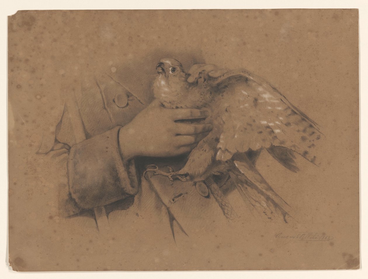 Turmfalke in Händen gefangen(Torenvalk gevangen in handen)August Allebe(draughtsman) |