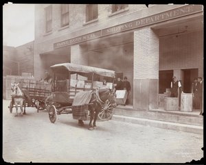schwarz-weiß-fotografie · schwarz-weiß-foto · pferd und wagen · pferde · flotte · konvoi · fahrer · lieferbote · transportwesen · new york · new york city · zwanzigerjahre · zwanzigerjahre · wall street crash · weltwirtschaftskrise · karren · werbung · geschäft · straßenszene · stadt · stadt · telefonleitungen · drähte · Museum of the City of New York, USA / Bridgeman Images |