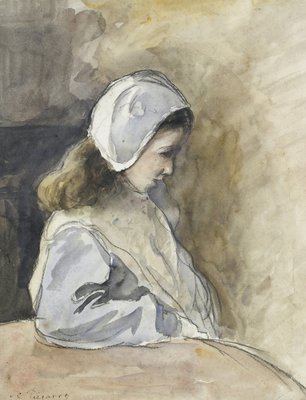 seitenansicht · frau · leute · kind · kinder · mädchen · mädchen · innen · zuhause · sitting · künste · land · französisch · frankreich · kunst · ernst · kleidung · farbe · farbe · grau · profil · mütze · kleid · tabelle · haar · position · jahrhundert · langes haar · nach innen · kreide · ernst · möbel · konzept · gesetzt · eine person · impressionist · pastell · 19. jahrhundert · impressionismus · 19.jahrhundert · watercolour · portrait · chalk · camille pissarro · jeanne · pissarro · black chalk · pissarro · camille · artist's daughter · artist's model · ashmolean museum · jeanne pissarro · jeanne-rachel pissarro · Ashmolean Museum, University of Oxford/Heritage Images