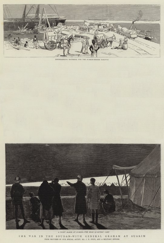 krieg · sudan · general graham · suakim · ausschiffungsmaterial · suakim berberbahn · nacht alram · lager des hauptquartiers · militär · sudan · Private Collection / Bridgeman Images · / Look and Learn |