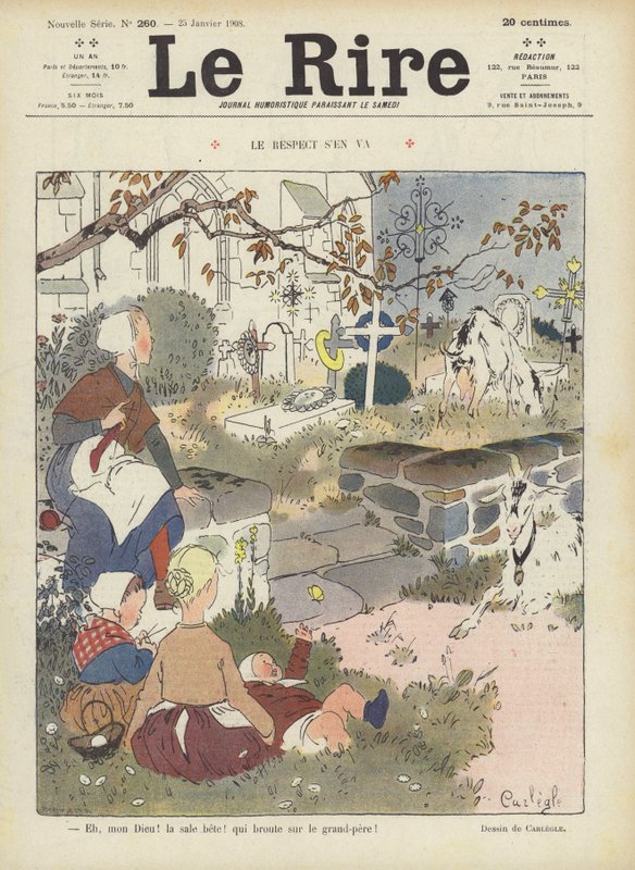le rire · zeitschrift · humor · humorvoll · comic · lustig · lustig · satire · satirisch · frankreich · französisch · karikatur · cartoons · karikatur · karikaturen · sozial · frau · kinder · baby · kirchhof · friedhof · gräber · tiere · vieh · ziegen · essen · gras · bauern · Private Collection / Bridgeman Images · / Look and Learn |