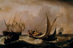 Kriegsschiffe vor Anker, der kommandierende Admiral wird zur Flaggschiff gerudert, ihre Segel beleuchtet(Warships Lying Offshore, the Commanding Admiral Being Rowed out to Join the Flagship, Her Sails Illu...)Charles Martin Powell |
