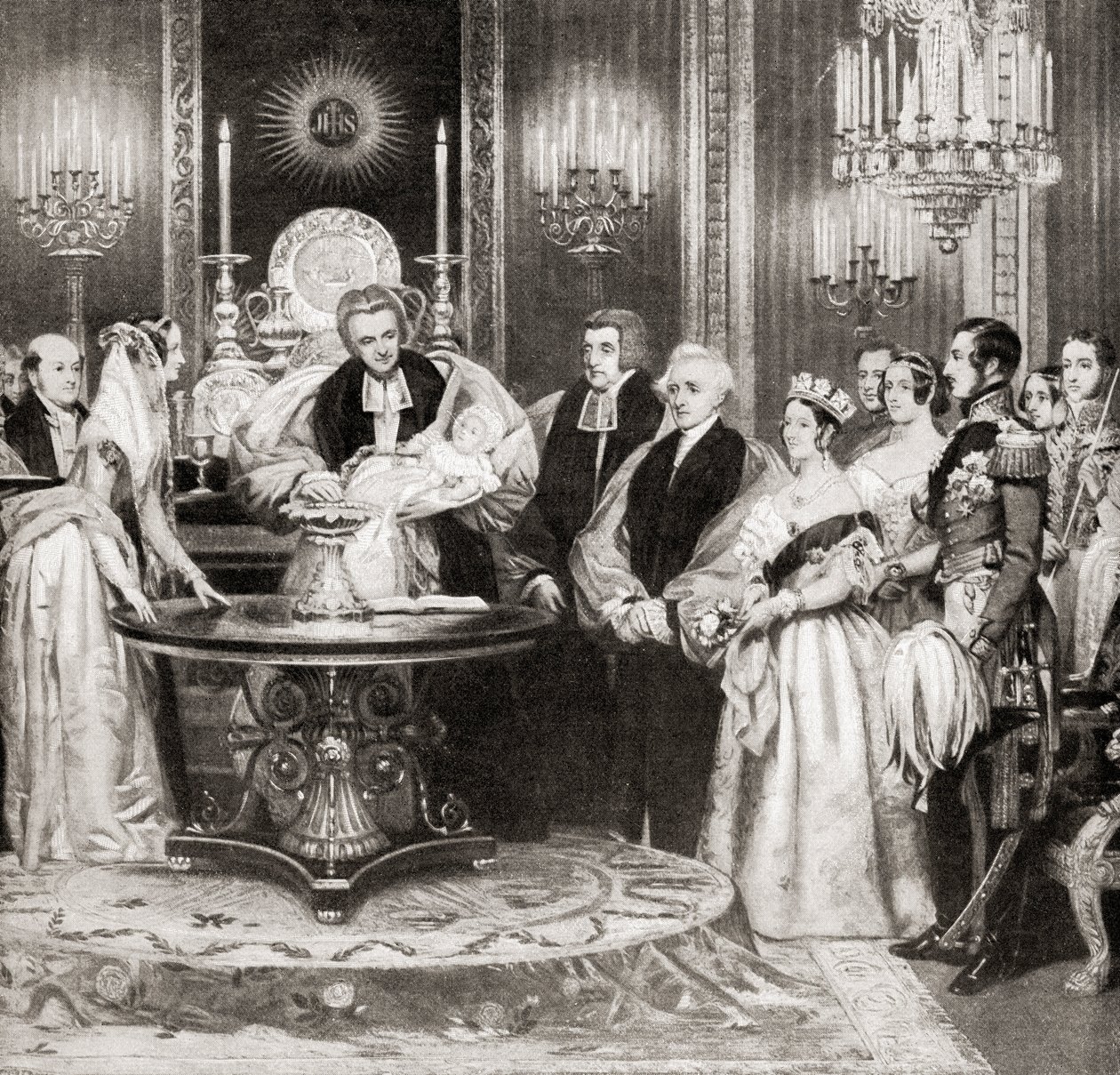 zeremonie · taufe · familie · private kapelle · interieur · taufe · königin victoria · tochter · höfling · höflinge · Private Collection / Bridgeman Images |