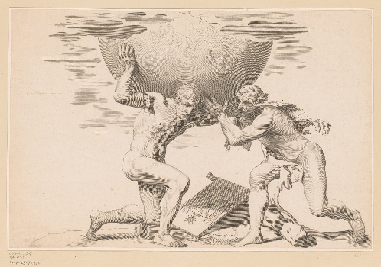 Atlas übergibt den Himmelsglobus an Herkules(Atlas geeft de hemelbol aan Hercules)Claude Mellan(print maker),Claude Mellan(after own design by) |