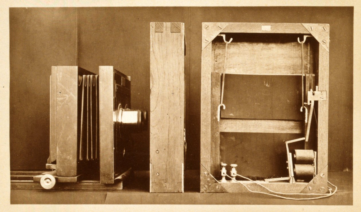 Kamera und Rückseite des Elektroschutters, verwendet von Eadweard Muybridge für seine 'Animal Locomotion' Serie, ca. 1881(Camera and back of electro-shutter used by Eadweard Muybridge to shoot his 'Animal Locomotion' series, c.1881 )Eadweard Muybridge |