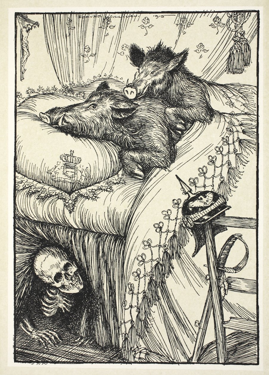 cartoon · karikatur · 20. jh. · erster weltkrieg · erster weltkrieg · erster weltkrieg · erster weltkrieg · erster weltkrieg · preußen · preußen · deutschland · deutsche · kaiser · kaiser · wilhelm ii · satire · satirisch · wildschwein · bett · skelett · Private Collection / Bridgeman Images |