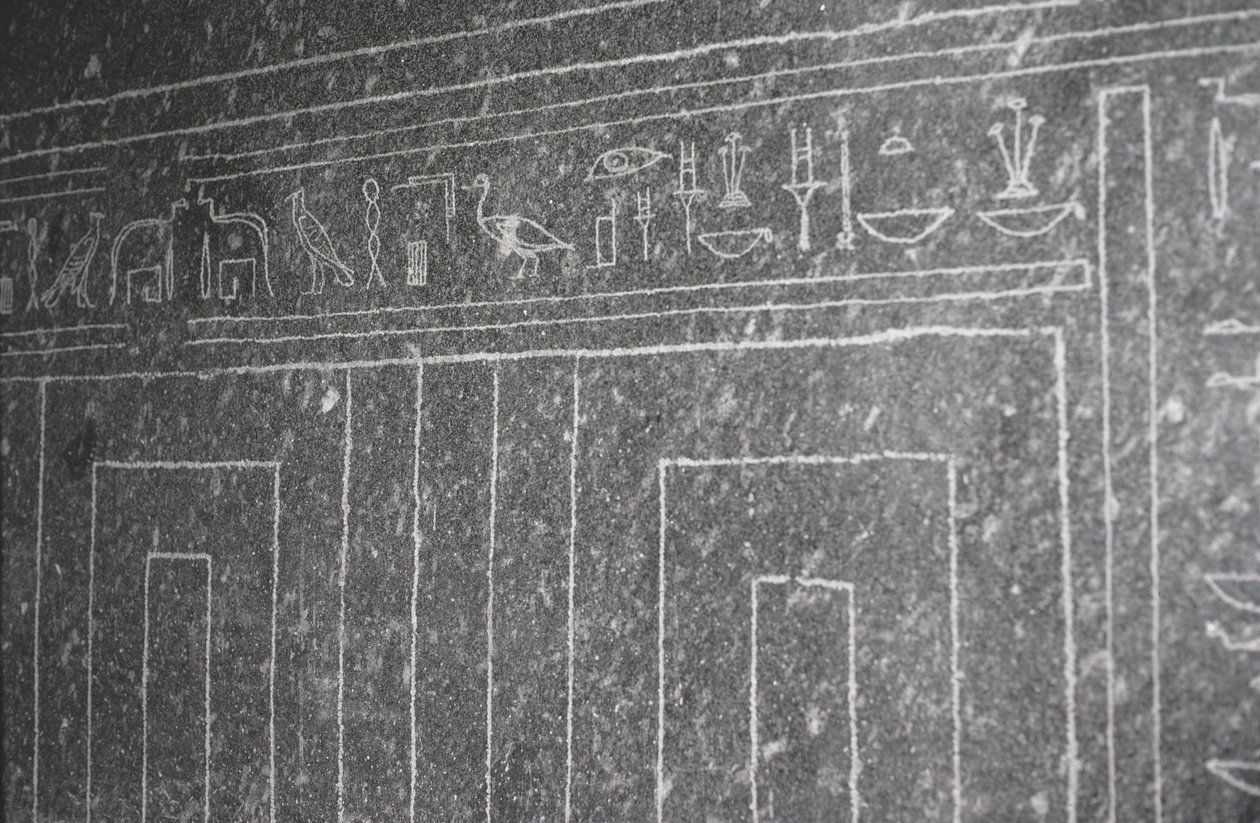 Versenktes Relief, das einen Tempel des Apis-Stier-Sarkophags im Serapeum zeigt, Neues Reich(Sunk Relief showing a temple of the Apis Bull sarcophagus in the Serapeum, New Kingdom )Egyptian 26th Dynasty |