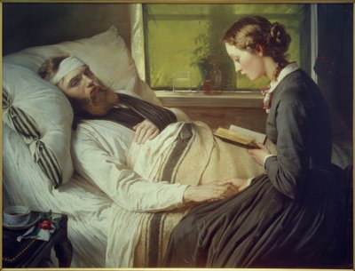bett · buch · deutsche · kunst · deutscher · krieg · eheleben · ehepaar · fenster · frau · frauenkunst · frauenleben · fürsorge · genesung · geschichte · handhalten · kopfkissen · kopfverletzung · krankenlager · krankenpflege · krankheit · kunst · lesen · allgemein · liebe · mann · medizin · militär · rose · soldat · teetasse · verband · verwundung · vorleserin · technik · gemälde · malerei · leinwand · ejerichau · Baumann · verwundete · Solda · Kopenhagen, Statens Museum For Kunst / akg-images
