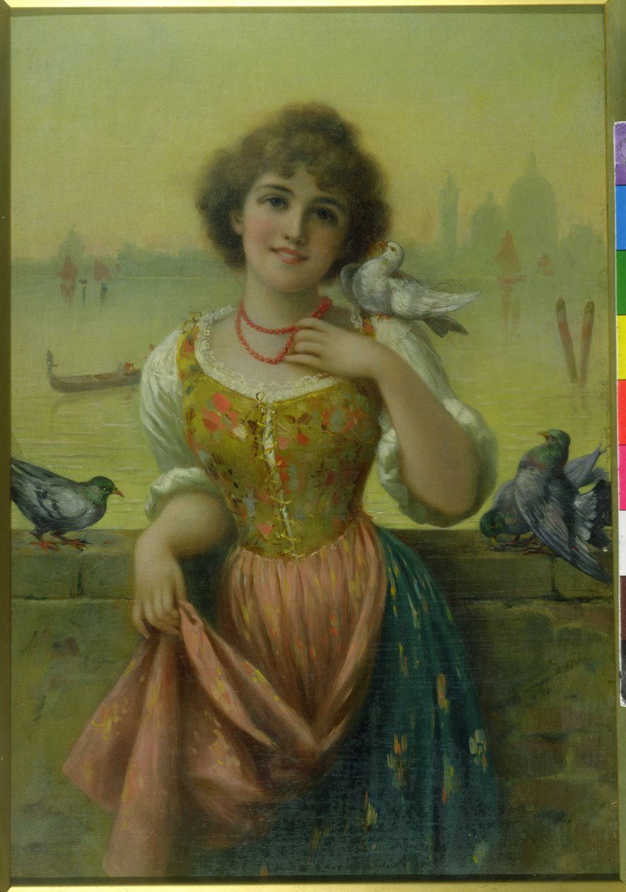 weiblich · porträt · junges mädchen · venedig · venezianer · drei viertel lang · vogel · vögel · zahm · taube · taube · tauben · kulisse · san marco · kanal · mauer · italienisch · Private Collection / Bridgeman Images |