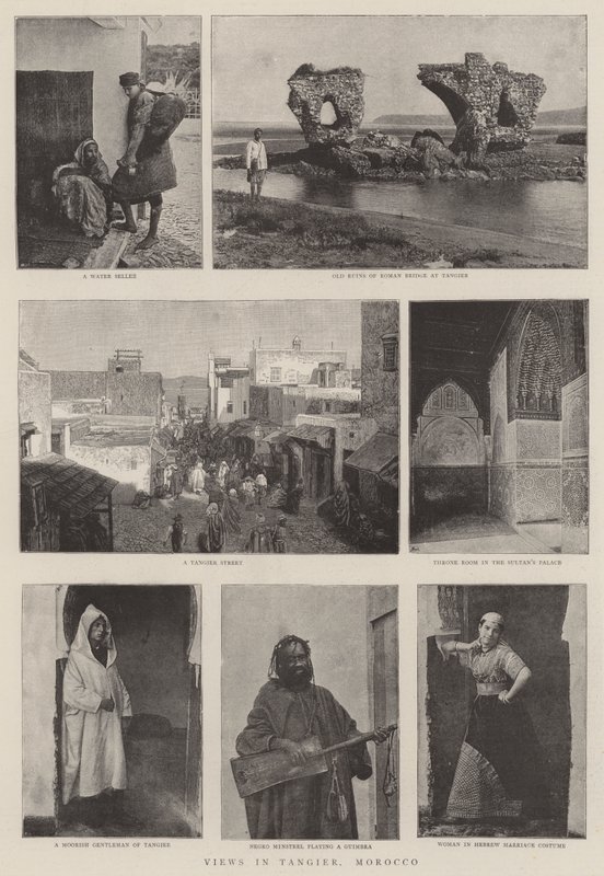ansichten · tanger · marokko · wasserverkäufer · alte ruinen · römische brücke · tanger straße · thronsaal · sultanspalast · maurischer gentleman · negro minstrel · spielen · guimbra · frau · hebräisches hochzeitskostüm · traditionelles kleid · Private Collection / Bridgeman Images · / Look and Learn |
