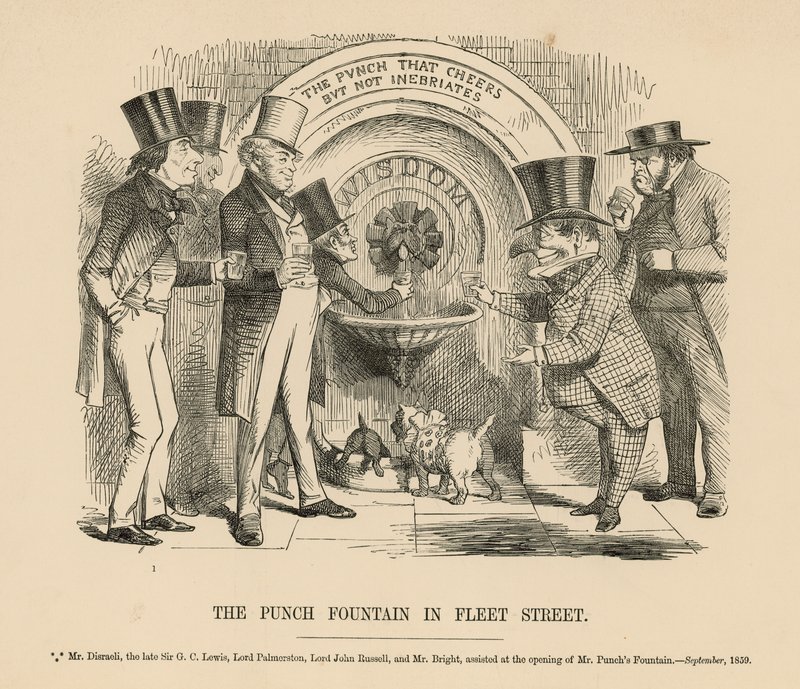 straßenbrunnen · trinkbrunnen · wasser · wasserversorgung · london · politiker · straßenszenen · cartoons · satire · punsch brunnen · fleet street · Private Collection / Bridgeman Images · / Look and Learn |