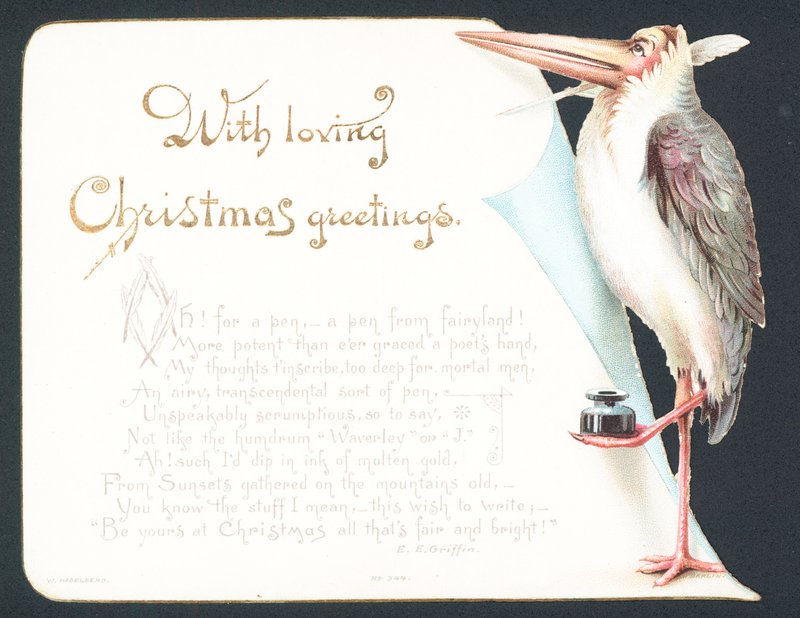 19. jahrhundert · karte · karten · weihnachten · englisch · ephemera · schöne grüße · illustration · abbildungen · sozial · geschichte · viktorianisch · winter · weihnachten · storch · vogel · vögel · tinte · schreiben · ee griffin · stift · feder · feder · gefieder · tintenfass · Private Collection / Bridgeman Images · / Look and Learn |
