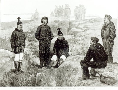 arktisexpedition · englisch · seeleute · treffen · eskimos · godhavn · die grafik · einheimische · einheimisch · entdecker · sitzung · stehen · litho · grönland · arktis · polar · regionen · expedition · Private Collection / Bridgeman Images · / Look and Learn