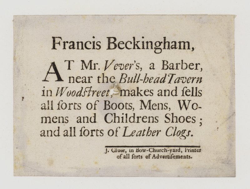 london · trade card · geschäftskarten · handel · handel · geschäft · besetzung · berufe · werbung · anzeige · 18. jahrhundert · achtzehntes jahrhundert · aktivitäten · werbung · werbe · unternehmen · geschäft · geschäfte · verkauf · einkaufen · einzelhandel · händler · kaufleute · stiefel · schuhmacher · francis beckingham · handel · karte · herr vever · barbier · bull' · s head tavern · wood street · stiefel · herren · frauen · kinder · leder clogs · cobbler · Private Collection / Bridgeman Images · / Look and Learn |