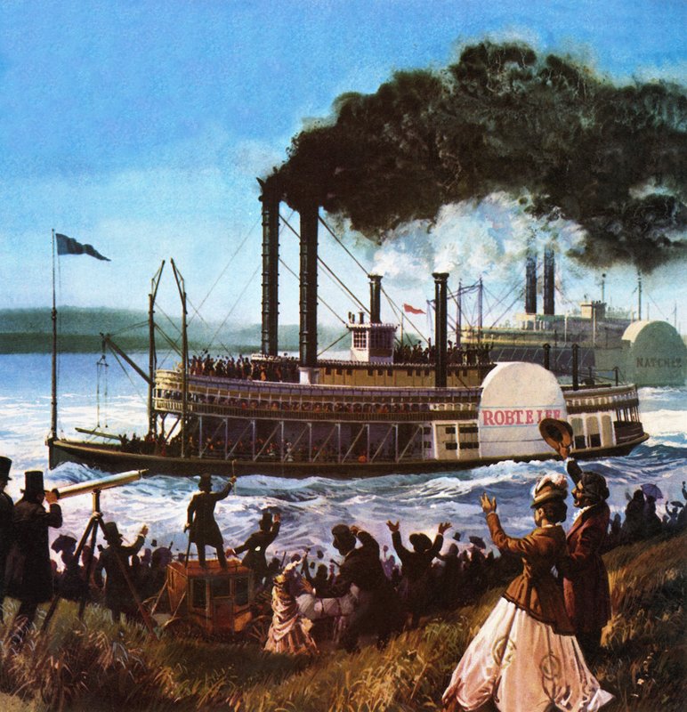 mississippi · dampfschiff · kapitäne · captain thomas p. leathers · natchez · cptain john w. cannon · robert e. lee · raddampfer · fluss · dampf · rauch · zuschauer · spekulanten · wettbewerb · Private Collection / Bridgeman Images · / Look and Learn |