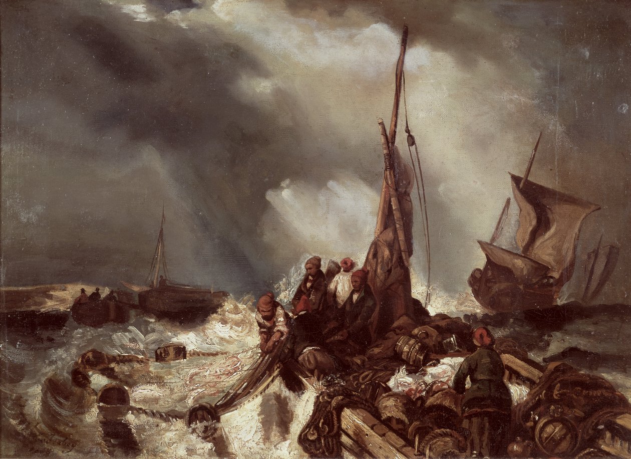fischerboot · fischer · aufgewühltes meer · trawler · schleppnetz · schleppnetz · fässer · seelandschaft · stürmisch · Private Collection / Bridgeman Images |