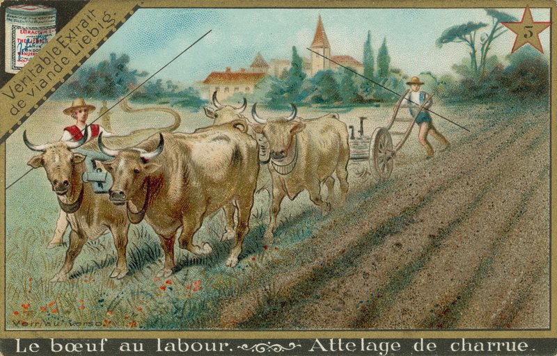 rindfleisch · kühe · vieh durch die zeiten · national · verwendet · behandlung · therapie · kühe · heilig · tier · ochsen ziehen · pflug · wagen · felder · dorf · landwirtschaft · arbeit · pflanzen · joch · Bauern · Private Collection / Bridgeman Images · / Look and Learn |