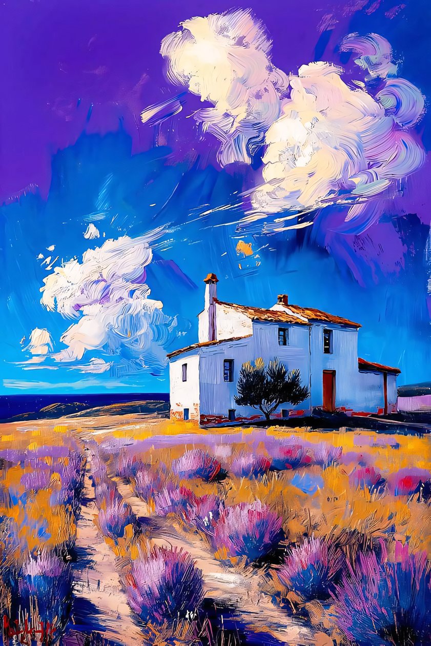 Landhauslandschaft, Lavendelfeld, blauer Himmel und weiße Wolken(Country house landscape, lavender field, blue sky and white clouds)F. Abderrahim |