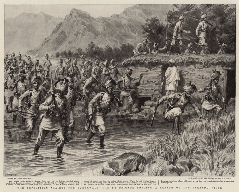 Die Expedition gegen die Bunerwals, die 1. Brigade durchquert einen Arm des Barandu-Flusses(The Expedition against the Bunerwals, the 1st Brigade fording a Branch of the Barandu River )Frank Dadd |