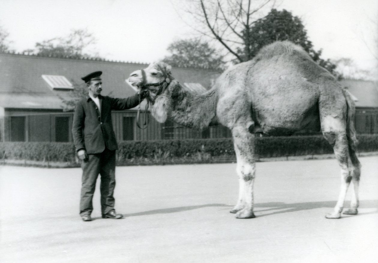 Ein Dromedar oder arabisches Kamel mit dem Pfleger W. Styles im Londoner Zoo, 1923(A Dromedary or Arabian Camel with keeper W. Styles at London Zoo in 1923 (bw photo))Frederick William Bond |
