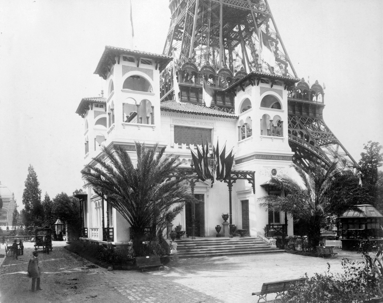 Pavillon von Monaco, mit der Basis des Eiffelturms im Hintergrund, Pariser Ausstellung, 1889(Pavillion of Monaco, with base of the Eiffel Tower in the background, Paris Exhibition, 1889 )French Photographer |
