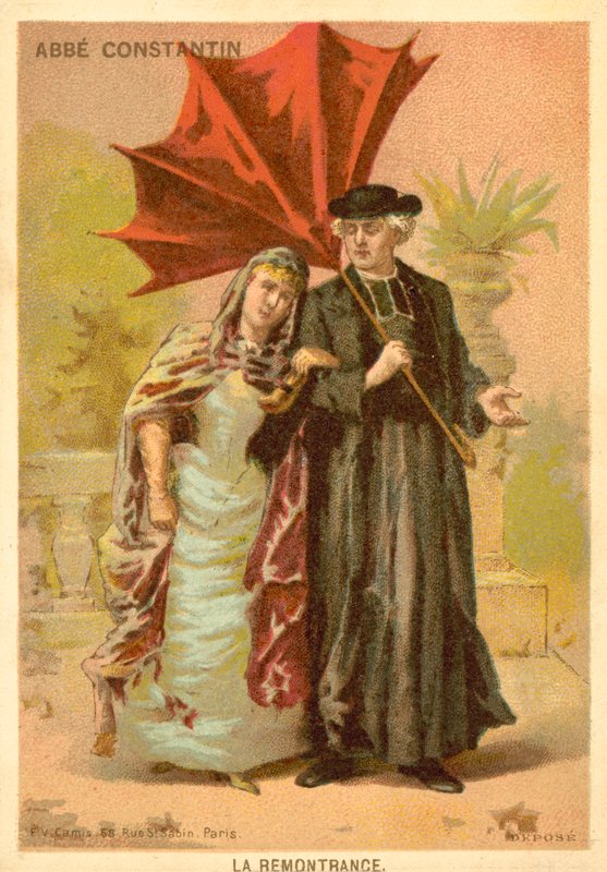 lehrreich · karte · karten · literatur · roman · abspielen · abbe constantin · protest · frau · regenschirm · von innen nach außen · gehen · ludovic halevy · Pierre Decourcelle · Private Collection / Bridgeman Images · / Look and Learn |