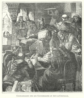 Karl der Große mit Schülern und Lehrern seiner Palastschule in Aachen, ca. 1890(Charlemagne with pupils and teachers of his Palace School at Aachen, c.1890 )French School |