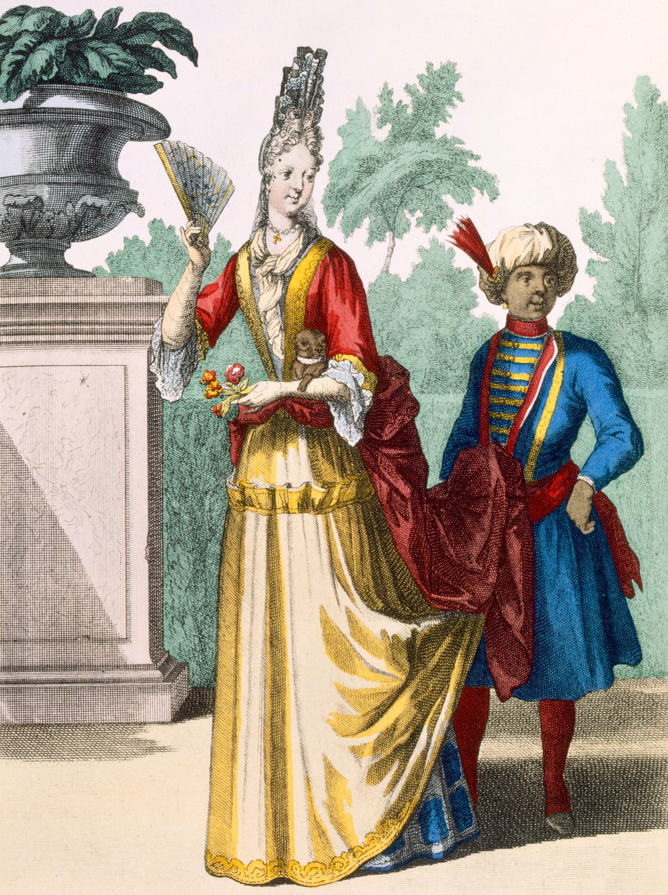 mode · tracht · tracht · frau · empire-linie · haube · stehen · ganzkörperansicht · diener · begleiter · page boy · blumen · turban · stinkerque · gelb · Garten · Park · Männchen · Private Collection / Bridgeman Images |