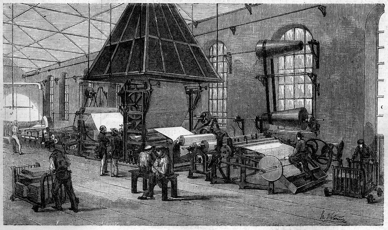 gravur · schwarzweiß · druck · arbeiter · gravur · französisch · presse · arbeit · herstellungstechnologie · papier · atelier · instrument · frankreich · bianchetticor · 19 · Private Collection / Bridgeman Images