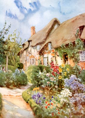 gebäude · gebäude · england · garten · farbe · farbe · häuschen · dorf · dach · rustic · position · jahrhundert · großbritannien · konzept · warwickshire · thatch · zwanziger jahre · thatched dach · zwanziger jahre · 16. jahrhundert · 20. jahrhundert · sechzehntes jahrhundert · stratford-nach-avon · landwirtschaftlich · landscape · anne hathaway · hathaway · anne · george f nicholls · gf nicholls · nicholls · george f · nicholls · nicholls · g f · The Print Collector/Heritage Images