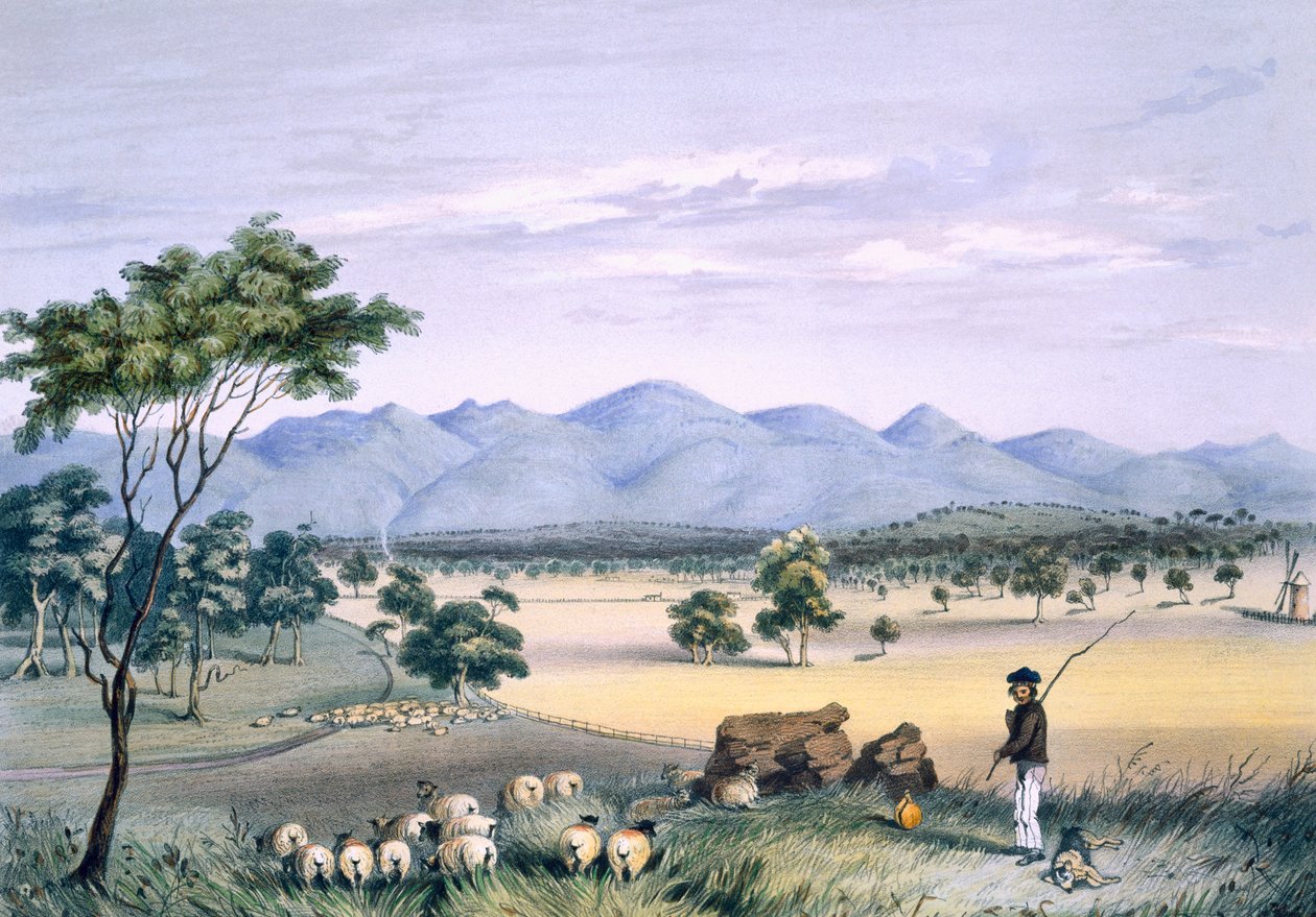 australien · einwanderung · kolonie · gemeinwesen · schaf · hirte · hund · berge · windmühle · eukalyptus · bäume · landschaft · landschaft · Private Collection / Bridgeman Images |