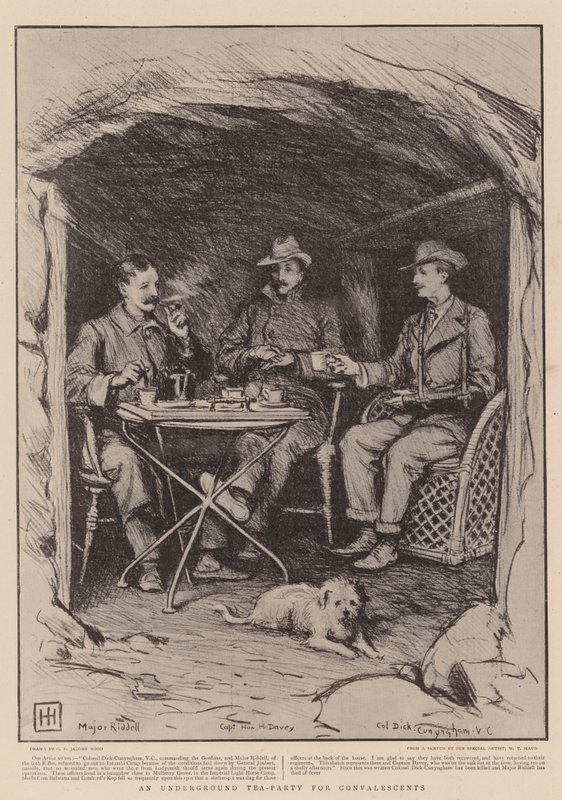 underground tea party · genesungsmittel · major riddell · kapitän honourable h davey · oberst dick cunyngham · militär · südafrika · Burenkrieg · Private Collection / Bridgeman Images · / Look and Learn |