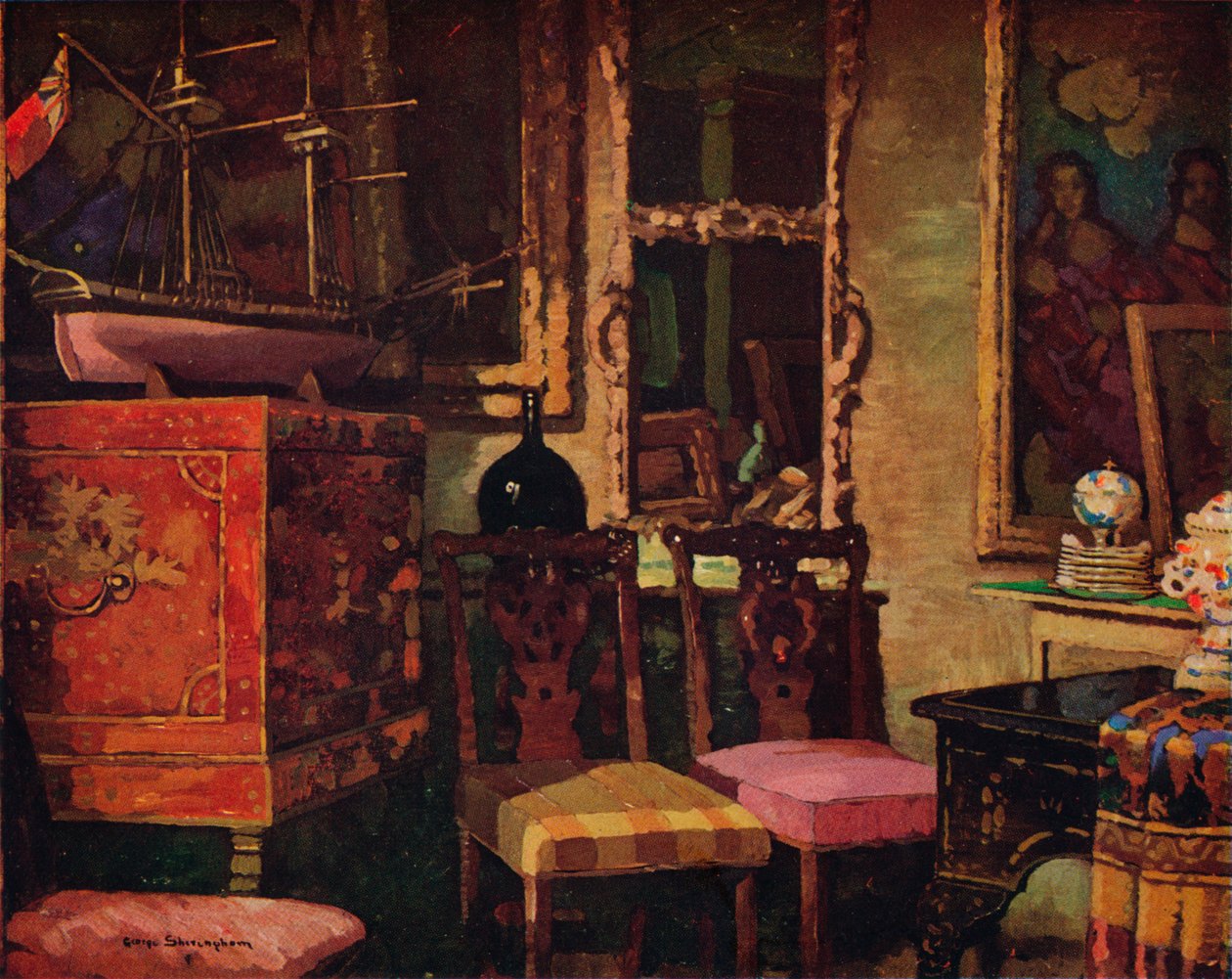 england · innen · zuhause · einkaufen · geschäft · geschäfte · pink · markt · handel · farbe · farbe · braun · bunt · antike · stuhl · jahrhundert · nach innen · möbel · birmingham · zwanziger jahre · auktion · publikation · westmidlands · antikes geschäft · auktionator · zwanziger jahre · 20. jahrhundert · antiques market · oil on panel · studio publications · george sherringham · sherringham · george · studio volume 95 · andrews of birmingham · The Print Collector/Heritage Images |
