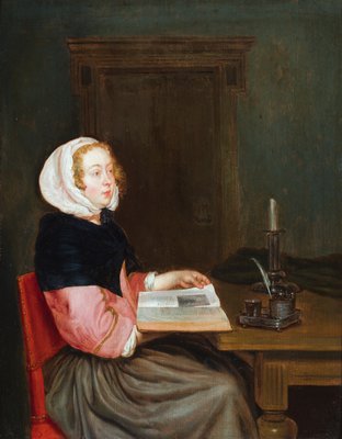 Ein Interieur mit einer Frau, die an einem Tisch sitzt und ein Buch hält(An interior with a woman seated at a table holding a book (oil on panel))Gerard ter (after) Borch or Terborch |