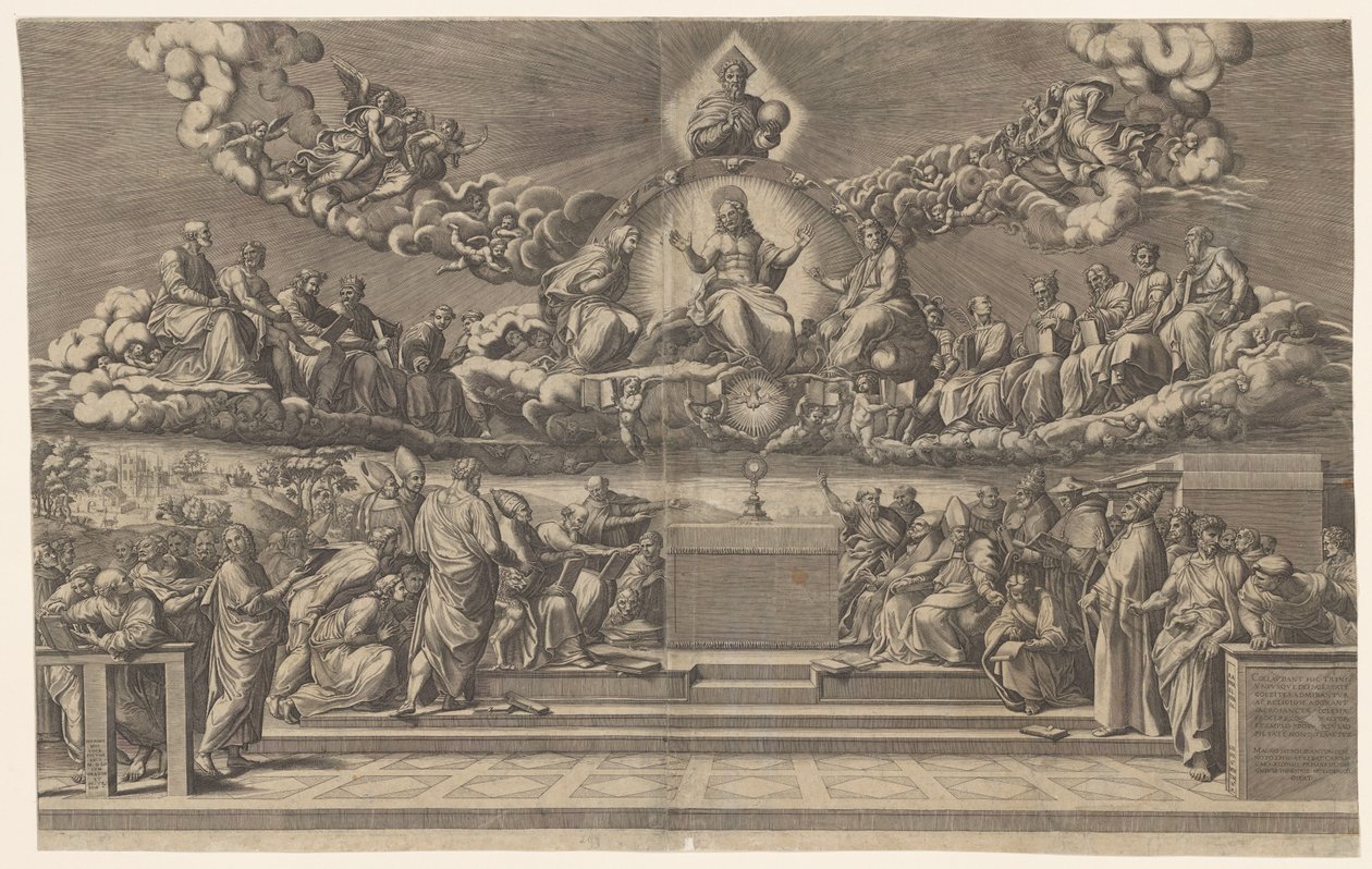 Disput über das Heilige Sakrament(Dispuut over het Heilige Sacrament)Giorgio Ghisi(print maker),Rafaël(after painting by),Hieronymus Cock(publisher) |