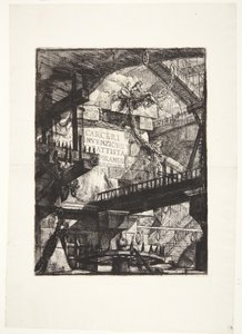 Titelbild mit Gesicht im Kerker und Titel an der Wand (Kerker)(Titelprent met gezicht in kerker en titel op muur Kerkers (series title) Invenzioni Capric di Carceri all Acqua Forte (series title on object))Giovanni-Battista Piranesi(print maker),Giovanni Battista Piranesi(after own design by),Giovanni Bouchard(publisher) |