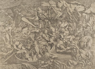 Seeschlacht zwischen den Trojanern und den Griechen(Zeeslag tussen de Trojanen en de Grieken)Giovanni Battista Scultori(print maker),Giulio Romano(after design by) |