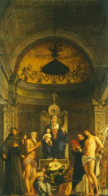 Altarbild des Heiligen Job: Jungfrau und Kind mit sechs Heiligen und musizierenden Engeln(Altarpiece of Saint Job: Virgin and Child with Six Saints and Musicians Angels (tempera on panel, ca. 1487))Giovanni Bellini |