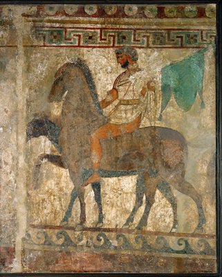 altgriechisch · wandmalerei · wandgemälde · männchen · soldat · kavallerist · kavalier · pferd · reiten · reiter · klassische kleidung · rüstung · flagge · banner · pferde · bestattung · grab · Museo Archeologico Nazionale, Naples, Campania, Italy / Bridgeman Images