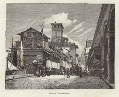 19. jahrhundert · die architektur · gebäude · gebäude · el mundo ilustrado · europa · europäisch · historisch · illustration · abbildungen · italienisch · italien · wahrzeichen · sehenswürdigkeiten · setzt · illustrierte welt · reise · ponte vecchio · alte brücke · brücke · brücken · florenz · mittelalterlich · sozial · geschichte · stadt · städte · straße · straßen · fußgänger · fußgänger · pferde · pferd · Wagen · Private Collection / Bridgeman Images · / Look and Learn
